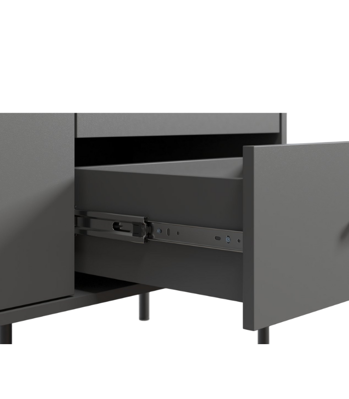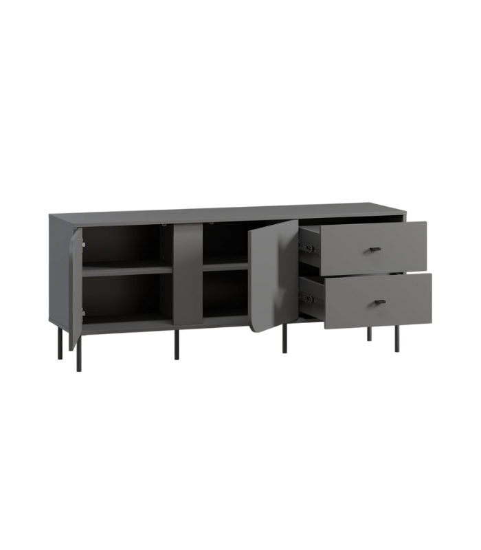 Thiết kế gồm hai cánh tủ và hai hộc kéo được bố trí thông minh, giúp lưu trữ các thiết bị giải trí, phụ kiện hoặc đồ dùng gia đình gọn gàng, tiện lợi. Các chi tiết góc bo nhẹ tinh tế, tạo cảm giác mềm mại và sang trọng cho tổng thể khối tủ.