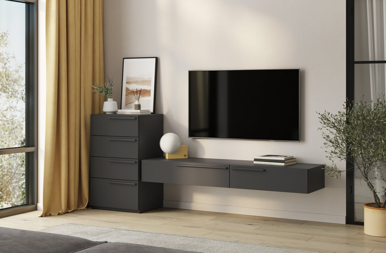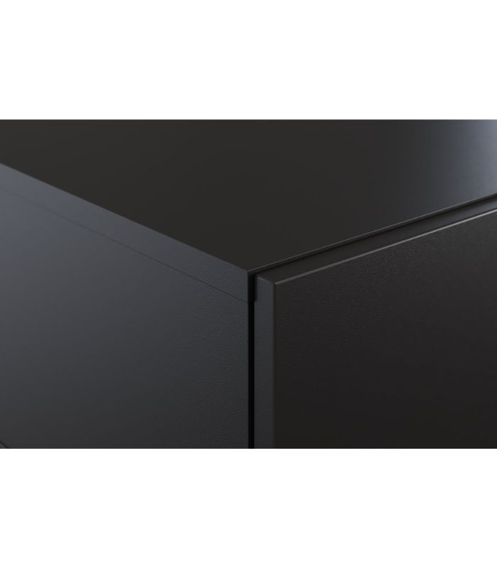 Cánh tủ được sơn PU 1 mặt, tạo bề mặt mịn, bóng nhẹ và dễ vệ sinh. Thiết kế gồm 2 ngăn kéo tiện lợi, giúp giấu gọn điều khiển, cáp, phụ kiện TV. Ngăn kéo trượt êm nhờ ray chất lượng cao, mang lại trải nghiệm sử dụng mượt mà. Tông đen tạo chiều sâu, giúp không gian thêm sang trọng và đẳng cấp.