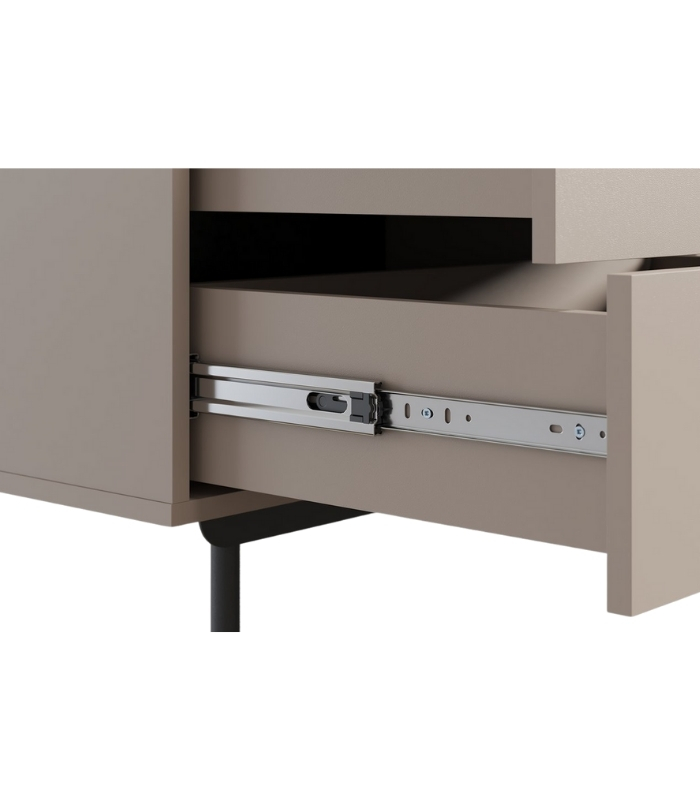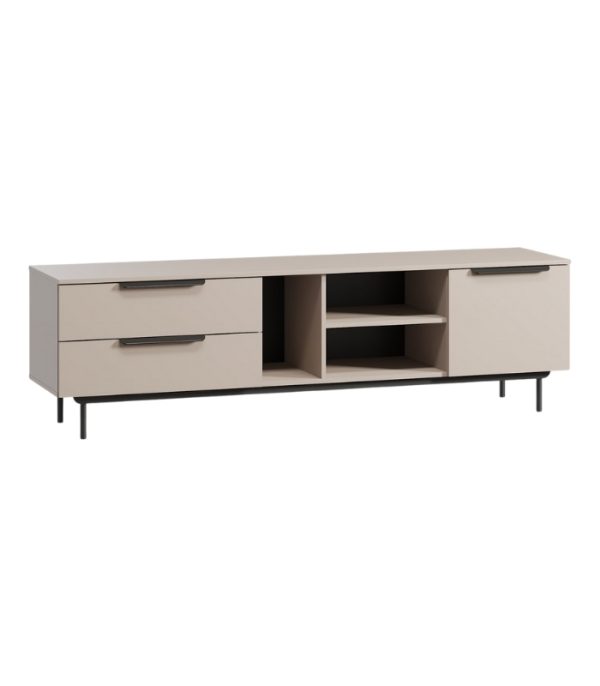 Kết cấu tủ được làm từ MDF phủ melamine chống ẩm, giúp hạn chế cong vênh và dễ dàng vệ sinh. Phần cánh tủ sơn PU 1 mặt mượt mà, có chiều sâu và tạo hiệu ứng sạch sẽ hơn khi nhìn. Thiết kế tủ gồm 2 ngăn kéo – 1 hộc mở – 1 khoang cánh, phân chia hợp lý để bố trí thiết bị giải trí, loa soundbar, modem hay các phụ kiện trang trí.