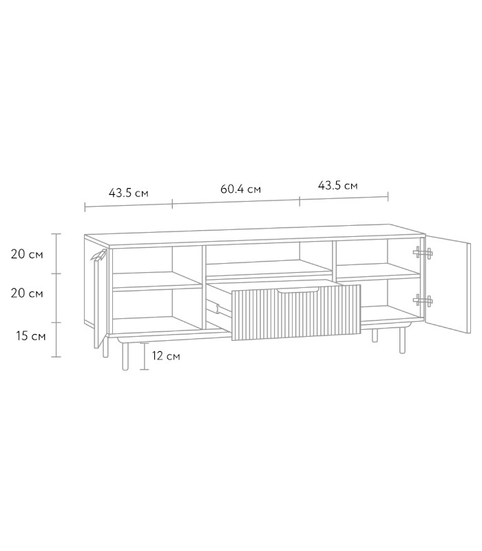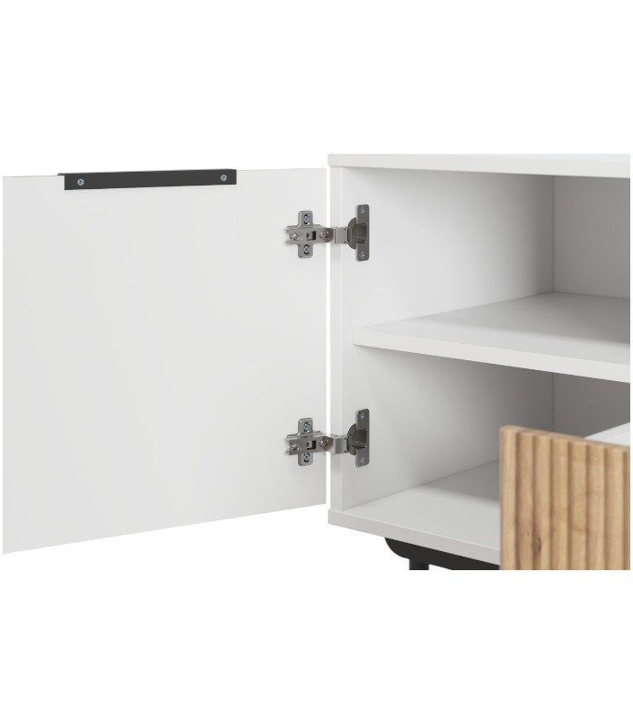 Tủ được thiết kế 2 cánh mở, bên trong chia thành 4 ngăn nhỏ, 1 ngăn mở tiện dụng và 1 hộc kéo linh hoạt, đáp ứng đa dạng nhu cầu lưu trữ – từ thiết bị giải trí, phụ kiện đến vật trang trí nhỏ. Chân sắt sơn tĩnh điện mang lại sự chắc chắn, đồng thời tạo dáng thanh mảnh, giúp tổng thể trở nên hiện đại và tinh gọn hơn.