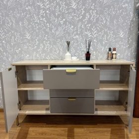Kích thước 139×50×53 cm phù hợp với đa số thiết kế nhà phố và căn hộ hiện nay. Hai cánh ngoài mở ra không gian ngăn kệ rộng, tiện cho việc đặt đầu thu, tài liệu hay các phụ kiện điện tử. Khu vực giữa gồm hai ngăn kéo tách biệt, giúp cất gọn đồ linh tinh như remote, dây sạc hay giấy tờ. Hoa văn trang trí trên mặt cánh tạo điểm nhấn tinh tế nhưng không phô trương, phù hợp với phong cách tối giản.