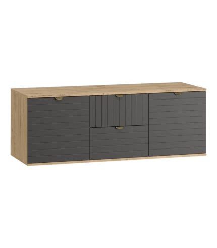 Với kích thước 139x50x53 cm, tủ đủ rộng để đặt tivi và lưu trữ các thiết bị phụ trợ. Thiết kế gồm 3 cánh: 2 cánh ngoài gồm 2 ngăn kệ, thuận tiện bố trí sách, vật dụng trang trí hoặc đầu DVD. Cánh giữa với 2 ngăn kéo, lý tưởng lưu trữ phụ kiện nhỏ, điều khiển, cáp điện gọn gàng.