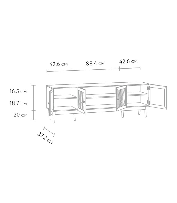 Thiết kế 4 cánh mở thông minh: hai bên là 4 ngăn nhỏ lý tưởng để sắp xếp thiết bị giải trí, sách báo hay vật dụng trang trí; trung tâm là 2 ngăn rộng rãi, giúp lưu trữ các thiết bị lớn hơn như đầu DVD, hay đồ decor, giữ không gian luôn ngăn nắp và tiện dụng.