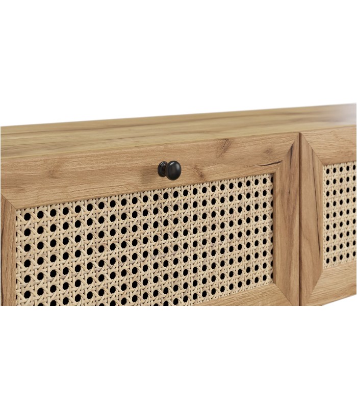 Sản phẩm được chế tác từ gỗ MDF dày 17mm phủ Melamine chống ẩm, bề mặt mịn màng, dễ vệ sinh và chống trầy xước nhẹ. Các cạnh dán chỉ PVC tỉ mỉ bởi thợ lành nghề, tăng độ bền và hoàn thiện tinh xảo. Vân gỗ tự nhiên kết hợp chi tiết lưới mắt cáo mang đến cảm giác ấm áp, gần gũi nhưng vẫn hiện đại và sang trọng.