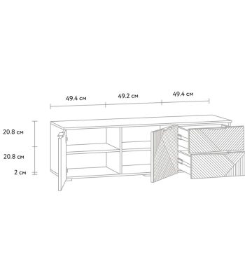 Kích thước 148x42x44 phù hợp với phòng khách căn hộ vừa và nhỏ Thiết kế tủ gồm 2 cánh mở, mỗi cánh bên trong là các ngăn kệ để sách, router, loa nhỏ hoặc phụ kiện tivi. Hai ngăn kéo ngoài cùng giúp lưu trữ điều khiển, dây cáp, giấy tờ hoặc các món đồ cần cất kín. Khung tủ chắc chắn, rộng đủ để đặt tivi 43–65 inch. Tone màu Trắng giúp không gian thoáng sáng, tạo cảm giác sạch sẽ và hiện đại. Dáng tủ vuông vức, gọn gàng dễ phối với sofa, bàn trà hoặc kệ trang trí. Bản lề êm giúp đóng mở nhẹ nhàng, hạn chế gây tiếng động.