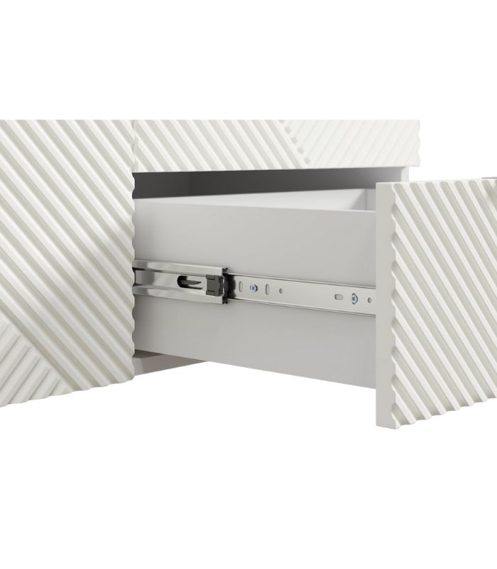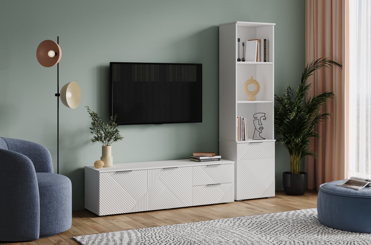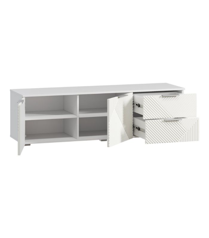 Kích thước 148x42x44 phù hợp với phòng khách căn hộ vừa và nhỏ Thiết kế tủ gồm 2 cánh mở, mỗi cánh bên trong là các ngăn kệ để sách, router, loa nhỏ hoặc phụ kiện tivi. Hai ngăn kéo ngoài cùng giúp lưu trữ điều khiển, dây cáp, giấy tờ hoặc các món đồ cần cất kín. Khung tủ chắc chắn, rộng đủ để đặt tivi 43–65 inch. Tone màu Trắng giúp không gian thoáng sáng, tạo cảm giác sạch sẽ và hiện đại. Dáng tủ vuông vức, gọn gàng dễ phối với sofa, bàn trà hoặc kệ trang trí. Bản lề êm giúp đóng mở nhẹ nhàng, hạn chế gây tiếng động.