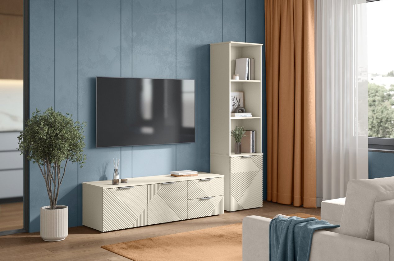 Tủ Tivi Shelton màu Trắng Kem đem đến cảm giác nhẹ nhàng, trang nhã và rất sang không gian phòng khách. Vật liệu MDF phủ melamine chống ẩm giúp tủ bền bỉ, ít bị ảnh hưởng bởi thời tiết. Cánh sơn PU 1 mặt tạo bề mặt đẹp, mịn và tinh tế.