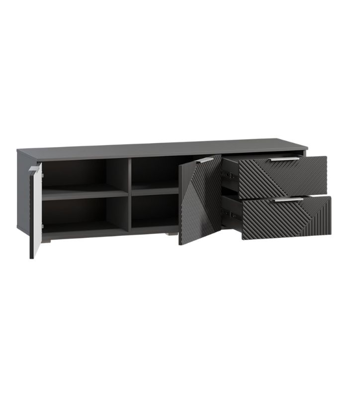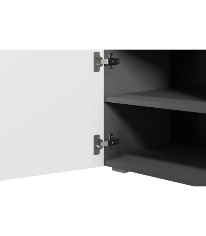 Tủ Tivi Shelton màu Xám Chì đem lại nét đẹp hiện đại, sang trọng và có chiều sâu cho không gian. MDF phủ melamine chống ẩm giúp tủ bền, chống phồng rộp và chống trầy tốt. Cánh phủ PU 1 mặt tạo bề mặt mịn, giữ màu ổn định và dễ vệ sinh.