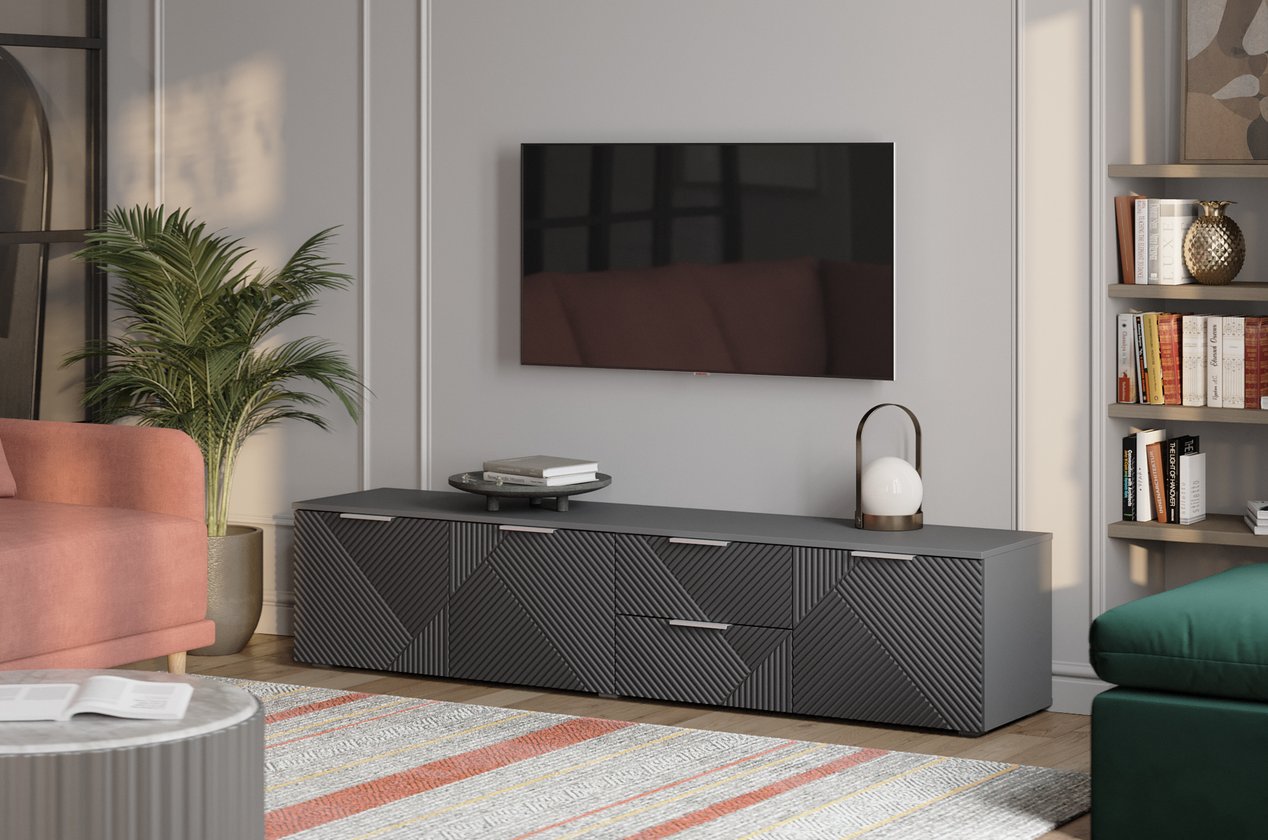 Kích thước 197x42x44 phù hợp nhiều không gian phòng khách hiện đại. Tủ gồm 4 cánh mở với bố cục lưu trữ cực kỳ tiện lợi. Cánh 1, 2 và 4 mở ra là các ngăn kệ chứa thiết bị điện tử, sách hoặc đồ dùng. Cánh 3 có 2 ngăn kéo hoàn hảo để cất đồ nhỏ khỏi tầm nhìn. Dáng tủ thấp, rộng, đặt vừa tivi lớn một cách sang trọng và cân đối. Màu Xám Chì đem đến sự trầm ổn, tinh tế và rất hợp với nội thất phong cách tối giản. Bề mặt dễ vệ sinh, phù hợp sử dụng hằng ngày.