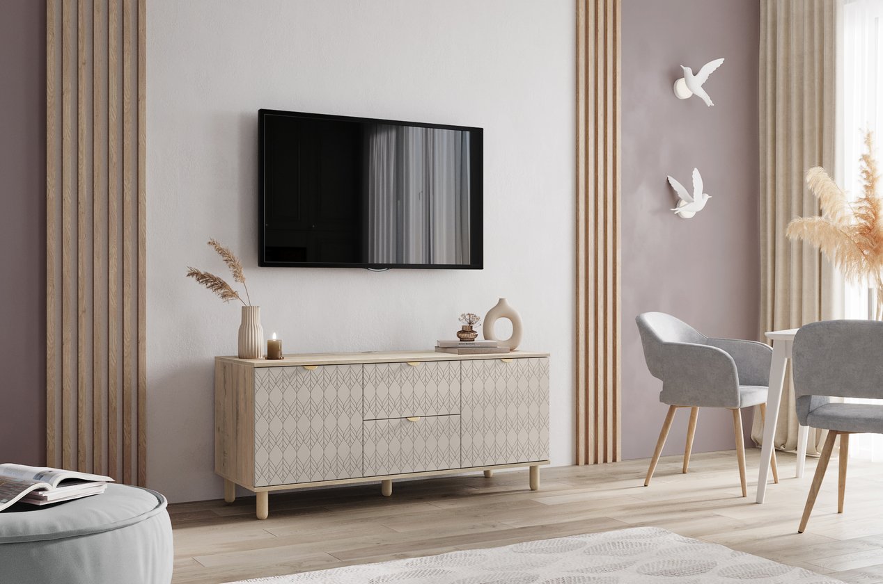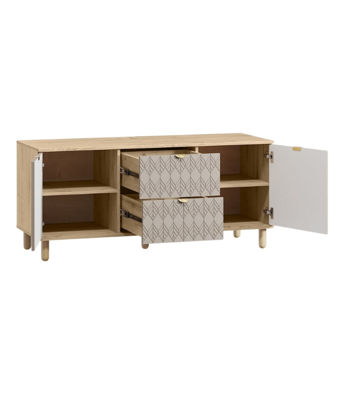 Tủ Tivi Tedjons – 1 Cà Phê Sữa mang đến vẻ ấm áp và thanh lịch đặc trưng nhờ gam màu nâu nhạt dịu mắt. Thiết kế hiện đại với hai cánh mở hai bên và hai ngăn kéo giữa giúp bố trí đồ điện tử, phụ kiện hoặc vật trang trí gọn gàng, tinh tế. Mặt tủ phẳng rộng, thuận tiện cho việc đặt tivi và tạo thêm không gian trưng bày cho phòng khách.