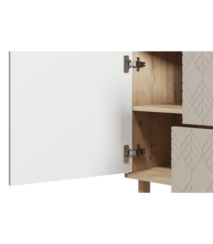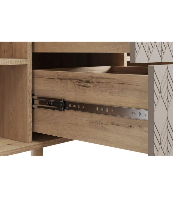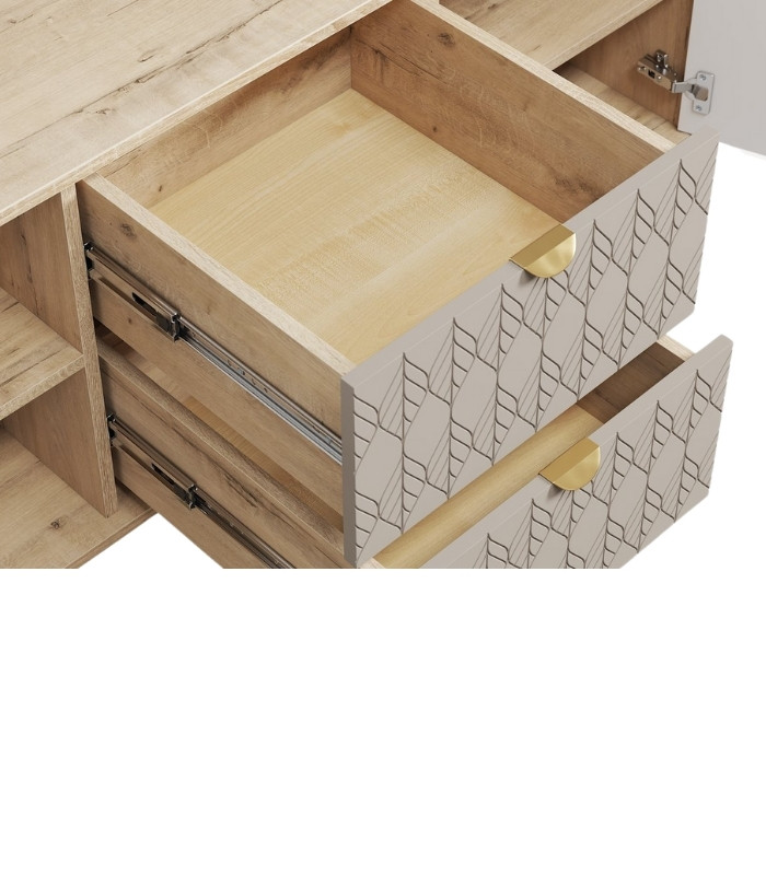 Các chi tiết được hoàn thiện tỉ mỉ, từ tay nắm vàng ánh kim cho đến họa tiết lá nhẹ nhàng trên mặt hộc kéo – dấu ấn đặc trưng của bộ sưu tập Tedjons. Cấu trúc bên trong chia ngăn hợp lý, tạo sự thuận tiện cho người dùng trong việc sắp xếp và cất giữ.