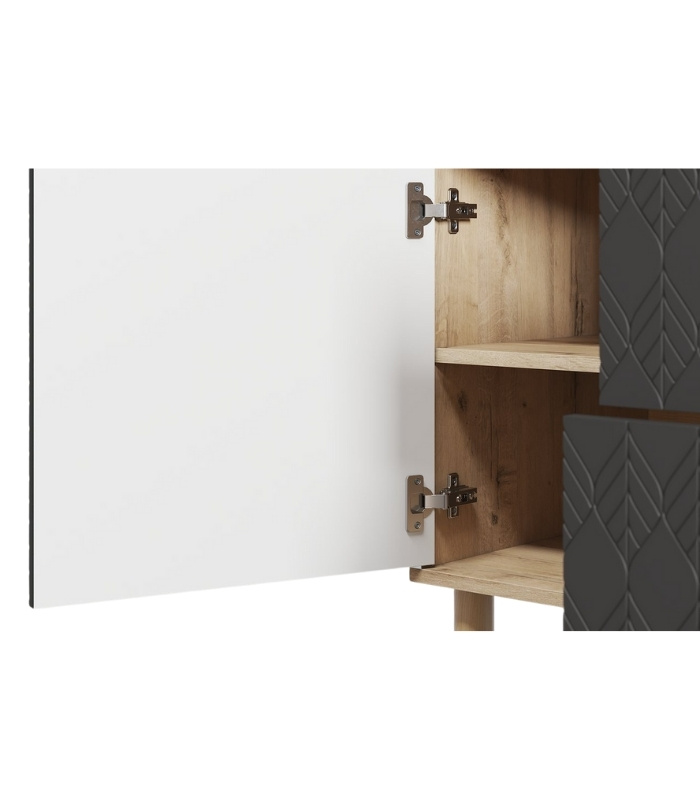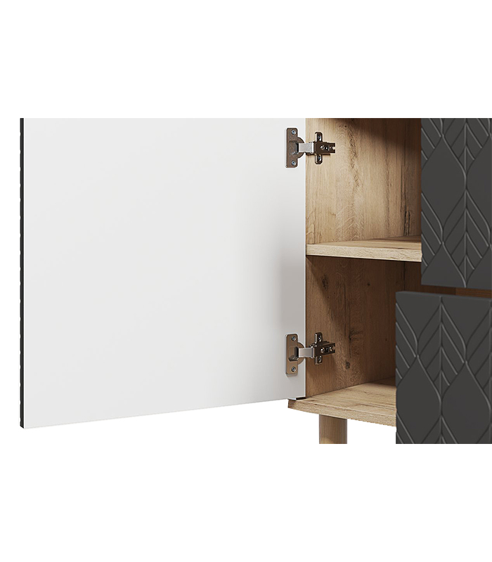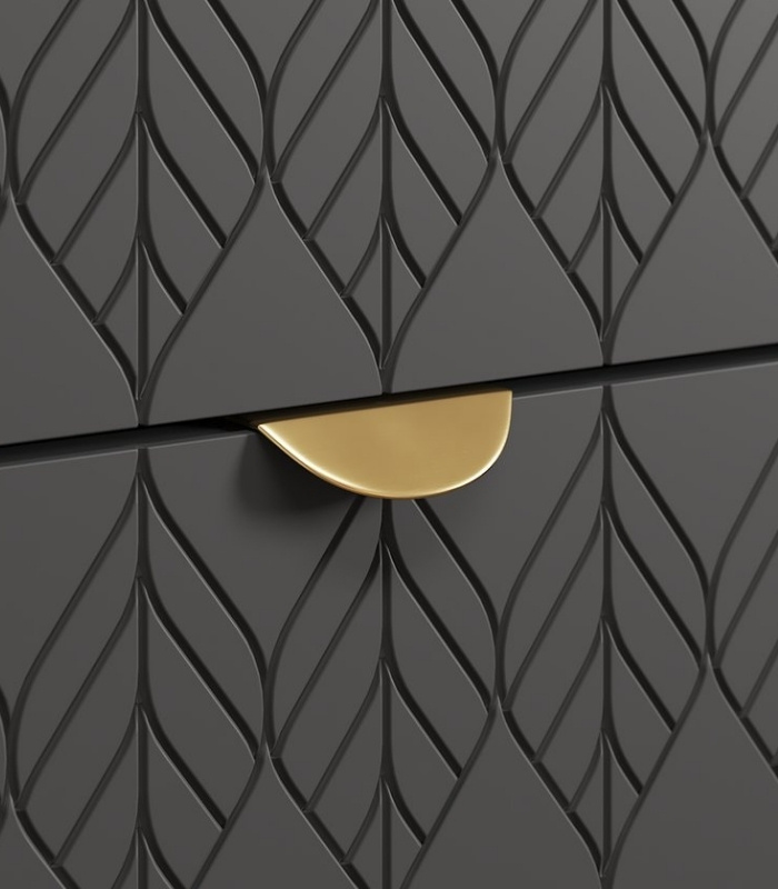 Cấu trúc tủ chia làm ba phần: hai cánh mở hai bên và hai ngăn kéo giữa, tạo nên sự cân đối cả về thẩm mỹ lẫn công năng. Tay nắm vàng ánh kim nổi bật trên nền xám trầm, kết hợp cùng chi tiết hoạ tiết lá tinh tế, thể hiện gu thẩm mỹ hiện đại của người sở hữu.