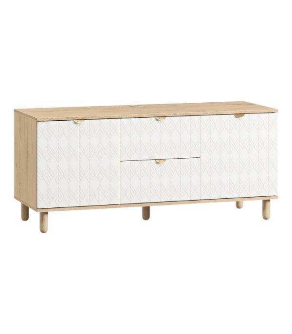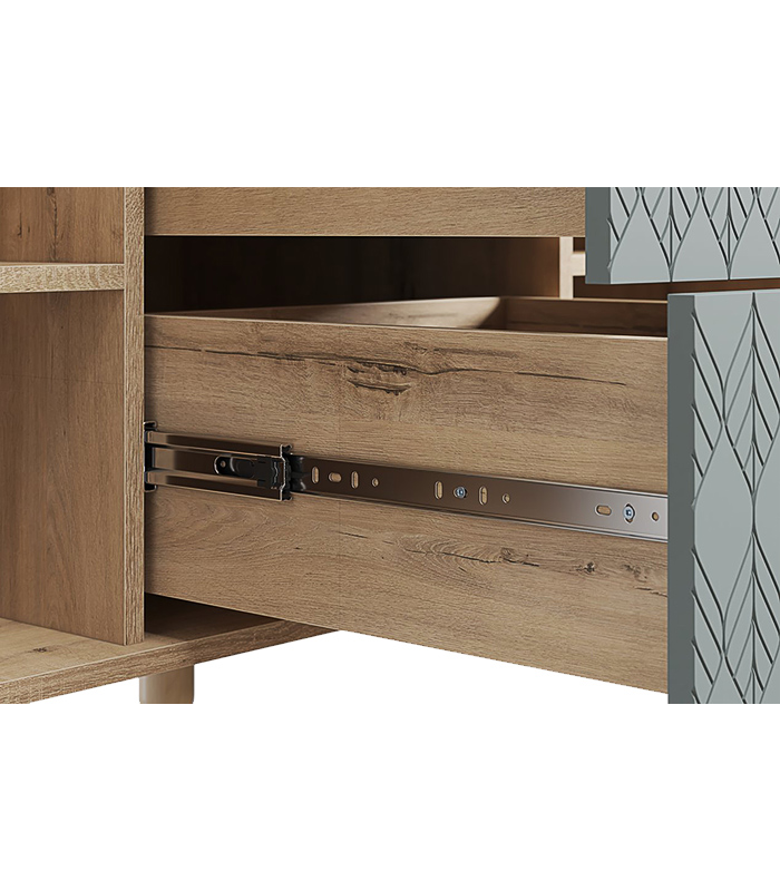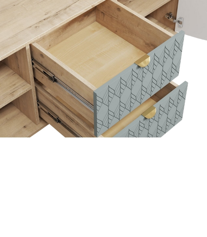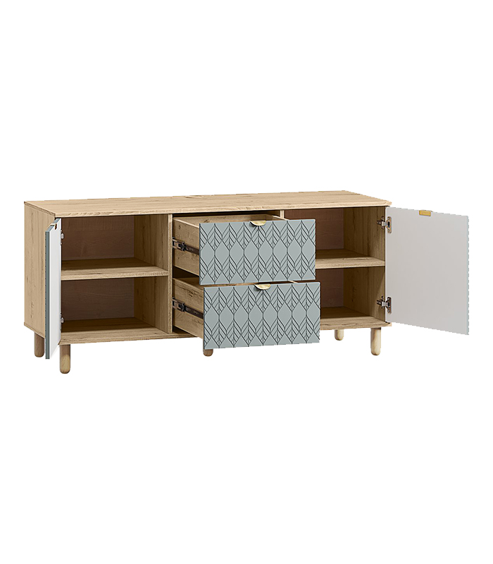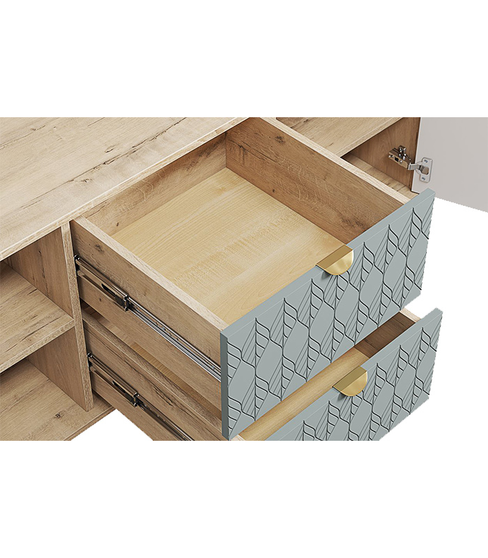Thiết kế cân đối gồm hai cánh mở hai bên, hai hộc kéo ở giữa – tiện lợi cho việc sắp xếp đồ điện tử, điều khiển, sách hoặc phụ kiện trang trí. Bề mặt tủ phẳng, dễ kết hợp cùng tivi, khung tranh hay bình hoa để tạo điểm nhấn trong không gian.