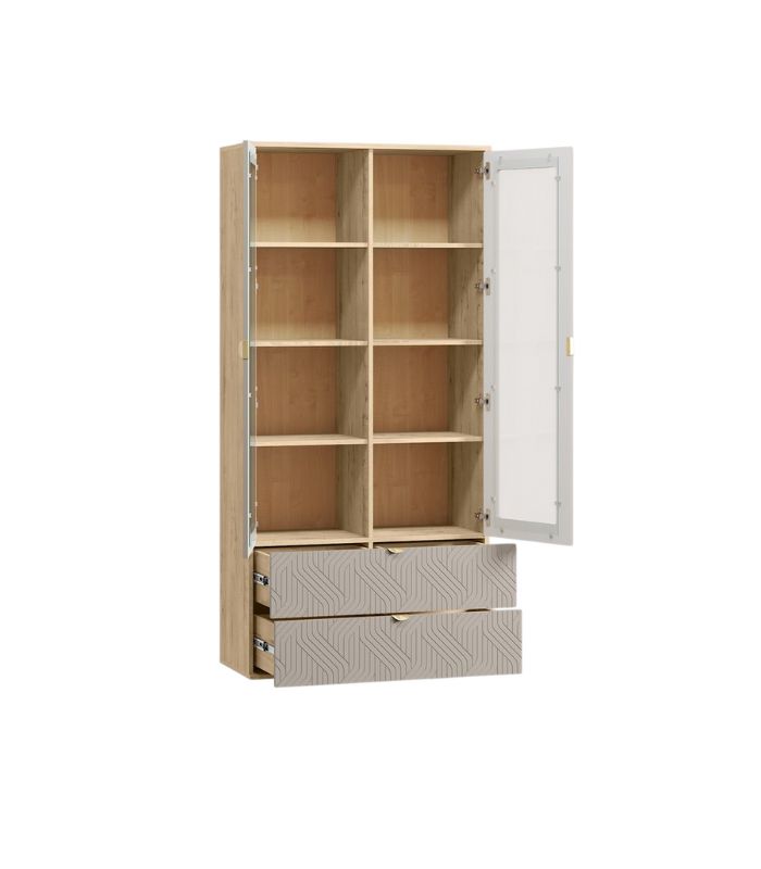 Kích thước 93×40×195 cm phù hợp đặt trong phòng khách, phòng thờ mini hay góc làm việc. Hai cánh kính phía trên giúp trưng bày sách, bình gốm, rượu vang hoặc đồ sưu tập một cách nổi bật. Các tầng kệ bố trí khoa học, giúp việc sắp xếp đồ decor trở nên thoải mái. Hai ngăn kéo dưới với họa tiết trang trí thanh thoát tạo điểm nhấn đặc trưng của dòng Mont Blanc Fancy.