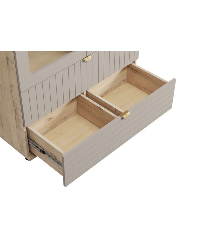 Với kích thước 93x40x195 cm, tủ cao nhưng gọn, tối ưu trưng bày và lưu trữ. Thiết kế gồm: 2 cánh kính trong suốt với các ngăn kệ rộng rãi, thuận tiện trưng bày sách, đồ lưu niệm, chén đĩa hoặc vật dụng trang trí. 2 ngăn kéo phía dưới giúp lưu trữ phụ kiện, vật dụng nhỏ, giữ không gian gọn gàng và ngăn nắp.