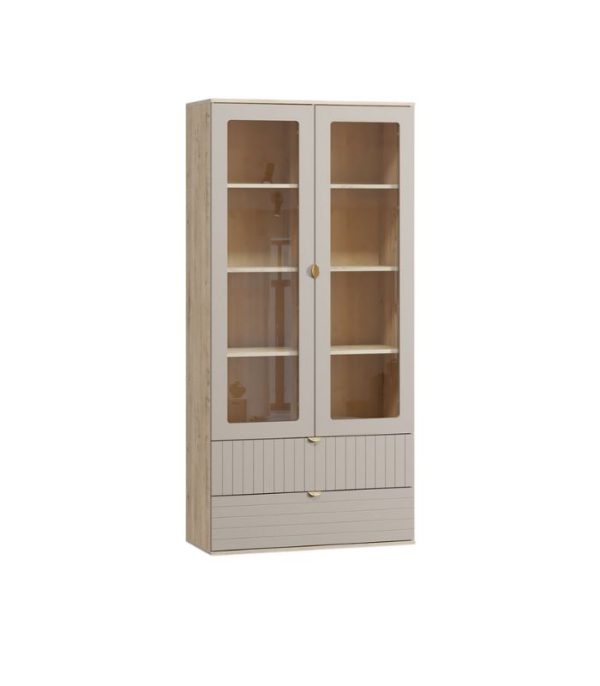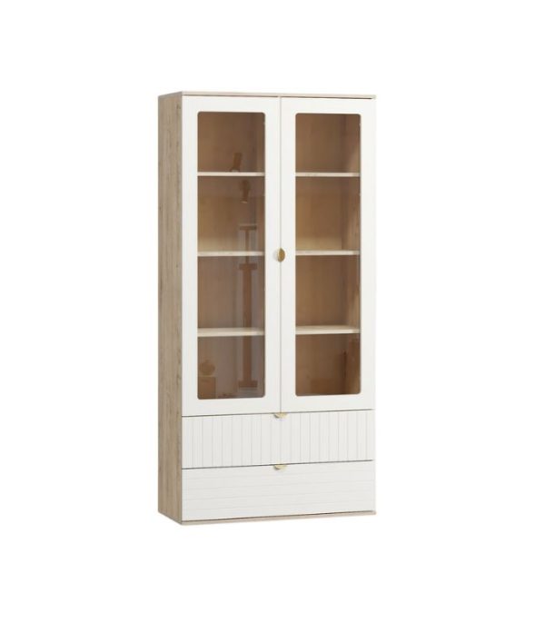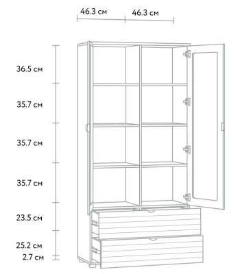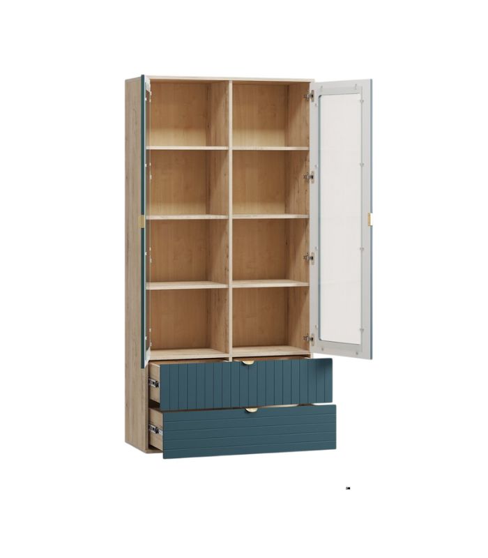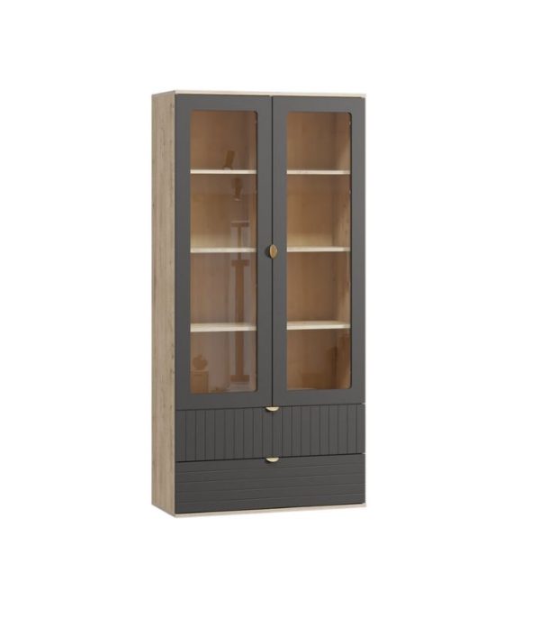 Với kích thước 93x40x195 cm, tủ cao, gọn, tối ưu trưng bày. Thiết kế gồm: 2 cánh kính trong suốt với các ngăn kệ rộng rãi, tiện trưng bày sách, chén đĩa, đồ lưu niệm hoặc vật dụng trang trí. 2 ngăn kéo phía dưới thuận tiện lưu trữ phụ kiện, vật dụng nhỏ, giúp không gian gọn gàng và khoa học.