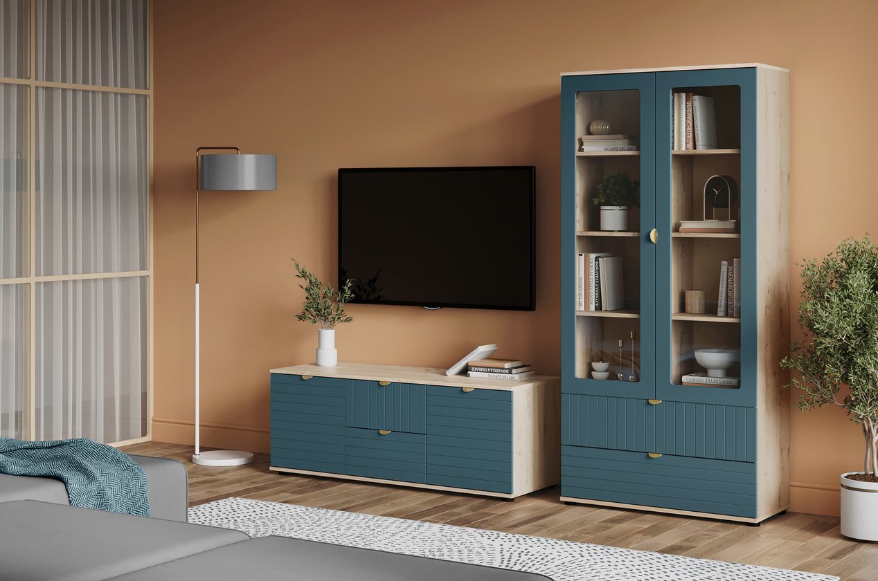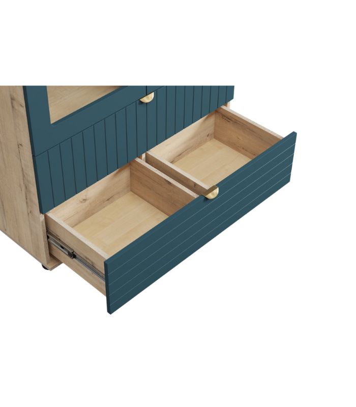 Tủ Mont Blanc Line Xanh Ngọc Navy-1 tạo điểm nhấn trẻ trung, năng động cho không gian phòng khách hoặc phòng làm việc. Chất liệu MDF phủ melamine chống ẩm bền bỉ, hạn chế cong vênh. Cánh tủ sơn PU một mặt bóng mịn, sang trọng, dễ vệ sinh.