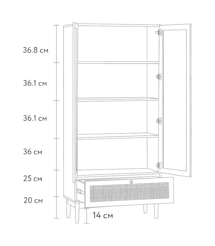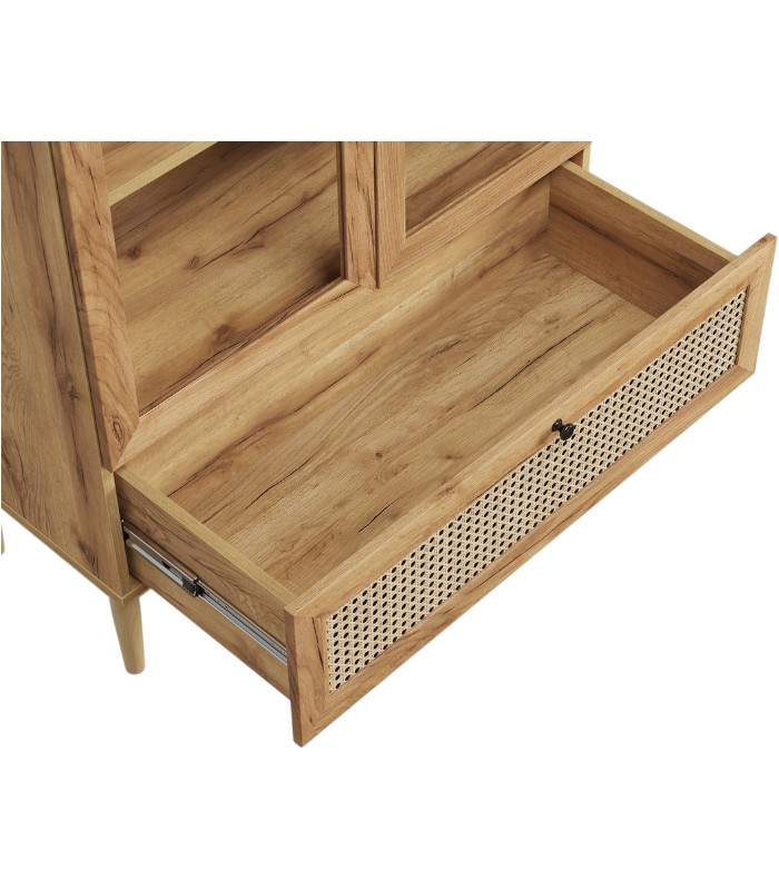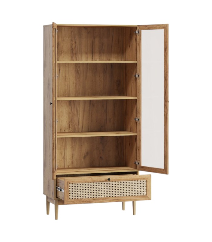 Thiết kế 2 cánh kính mở bên trên giúp trưng bày sách, decor hay bộ sưu tập yêu thích một cách gọn gàng và nổi bật. Phía dưới là 1 hộc kéo lớn, cung cấp không gian lưu trữ kín đáo cho những vật dụng cần bảo quản, giữ tổng thể luôn gọn gàng và ngăn nắp.