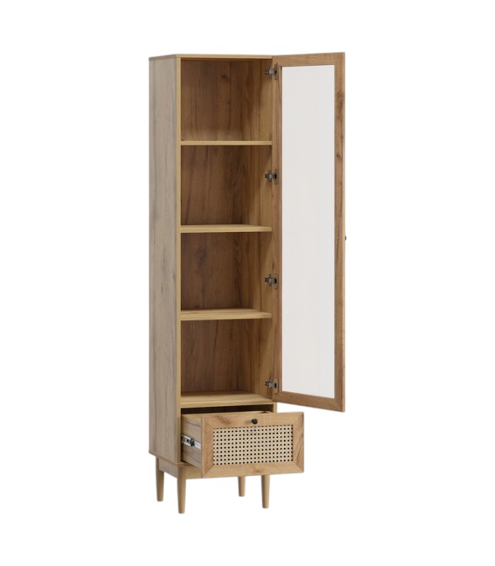 Thiết kế 1 cánh kính mở bên trên với 4 ngăn trưng bày giúp vật dụng của bạn được phô bày một cách tinh tế và gọn gàng. Phía dưới là 1 hộc kéo nhỏ, thuận tiện lưu trữ những vật dụng cần thiết, giữ cho tổng thể tủ luôn ngăn nắp và gọn gàng.