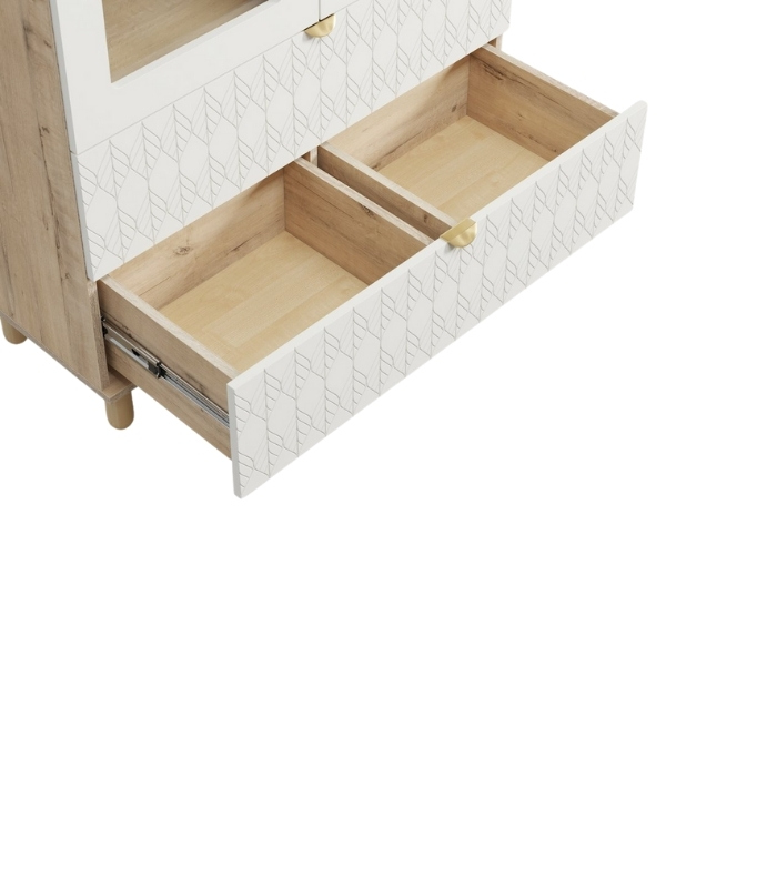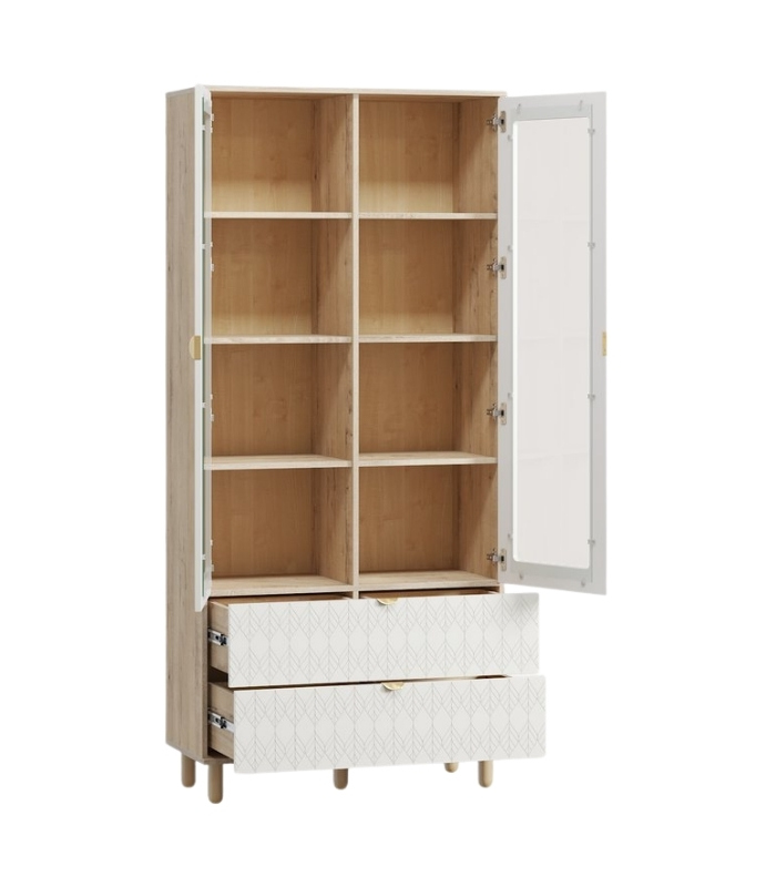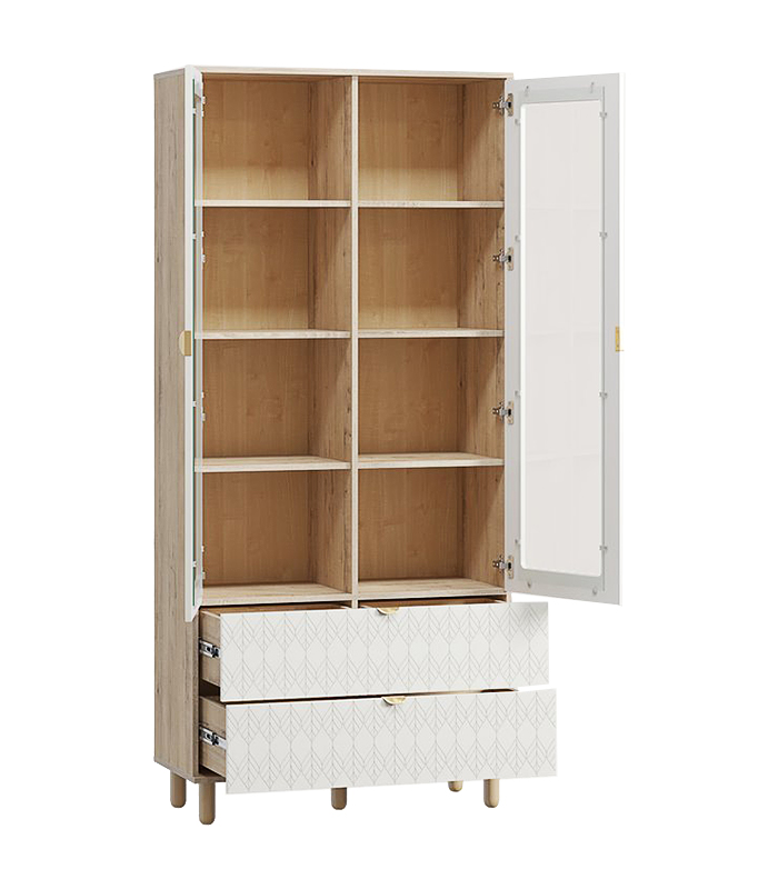 Thiết kế cánh kính đối xứng mang lại cảm giác cân bằng, trong khi hai ngăn kéo họa tiết hình học khắc chìm ở phần dưới tạo nên nét phá cách tinh tế. Đây là nơi hoàn hảo để trưng bày những vật phẩm yêu thích – từ sách, tượng nhỏ đến ly tách, lọ hoa – tất cả đều được tôn vinh qua lớp kính trong veo.