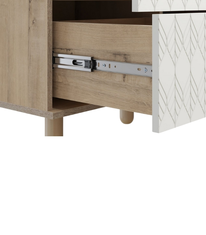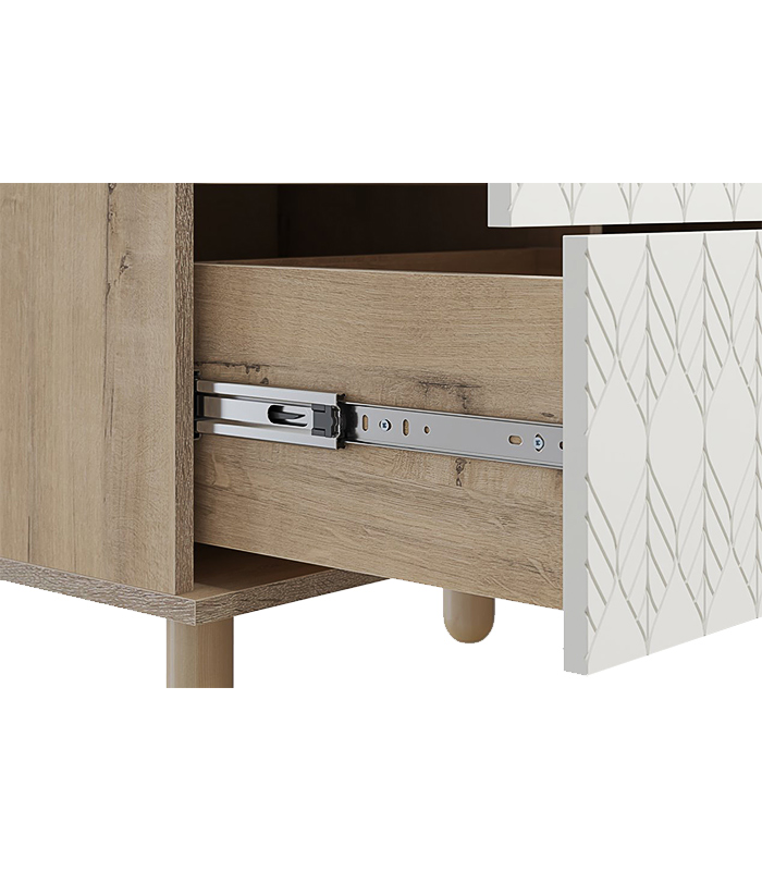 Chất liệu MDF phủ melamine chống ẩm giúp tủ luôn giữ dáng đẹp theo thời gian, còn cánh sơn PU đem lại bề mặt mịn màng và cảm giác sang trọng khi chạm tay. Mọi đường nét đều được hoàn thiện tỉ mỉ, đem lại sự chắc chắn và độ bền cao.