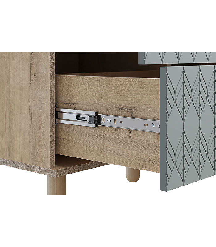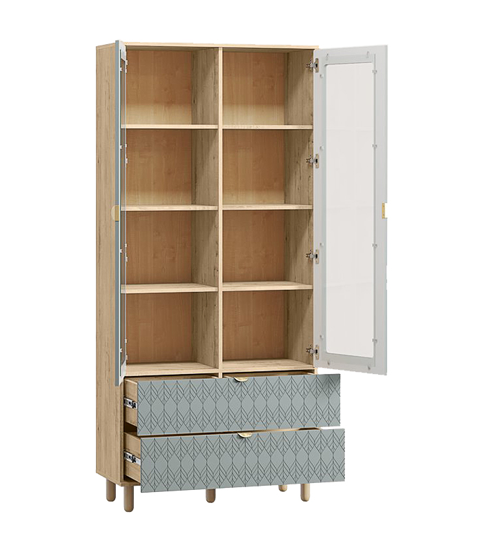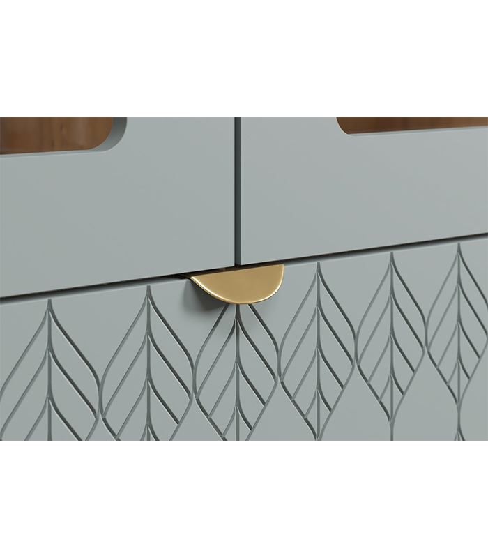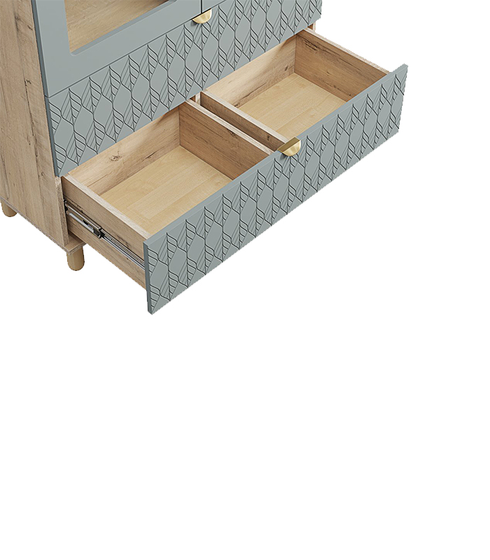 Thiết kế với cánh kính trong suốt giúp phô bày vẻ đẹp của những món đồ bên trong mà không gây rối mắt. Hai ngăn kéo phía dưới được trang trí bằng họa tiết khắc hình học tinh tế – một chi tiết nhỏ nhưng tạo nên sự đồng điệu giữa tính thẩm mỹ và công năng.